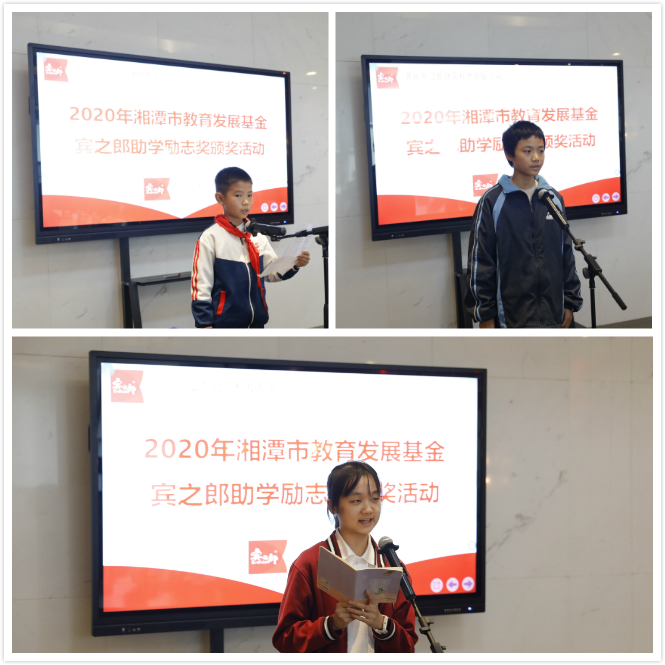 湘潭市政協副主席周佩珞宣讀《關于表彰2020年湘潭市教育發展基金·賓之郎助學勵志獎獲獎學生通報》,2020年,共有349名同學獲得“賓之郎·助學勵志獎”表彰獎勵。他表示,希望獲獎同學以堅強的意志,砥礪奮斗,處逆境而立志成才;也希望廣大中小學生以獲獎學生為榜樣,樹立遠大理想,發奮學習,做有理想、有志向、有擔當的新時代好少年,為實現中華民族偉大復興而拼搏奮進。