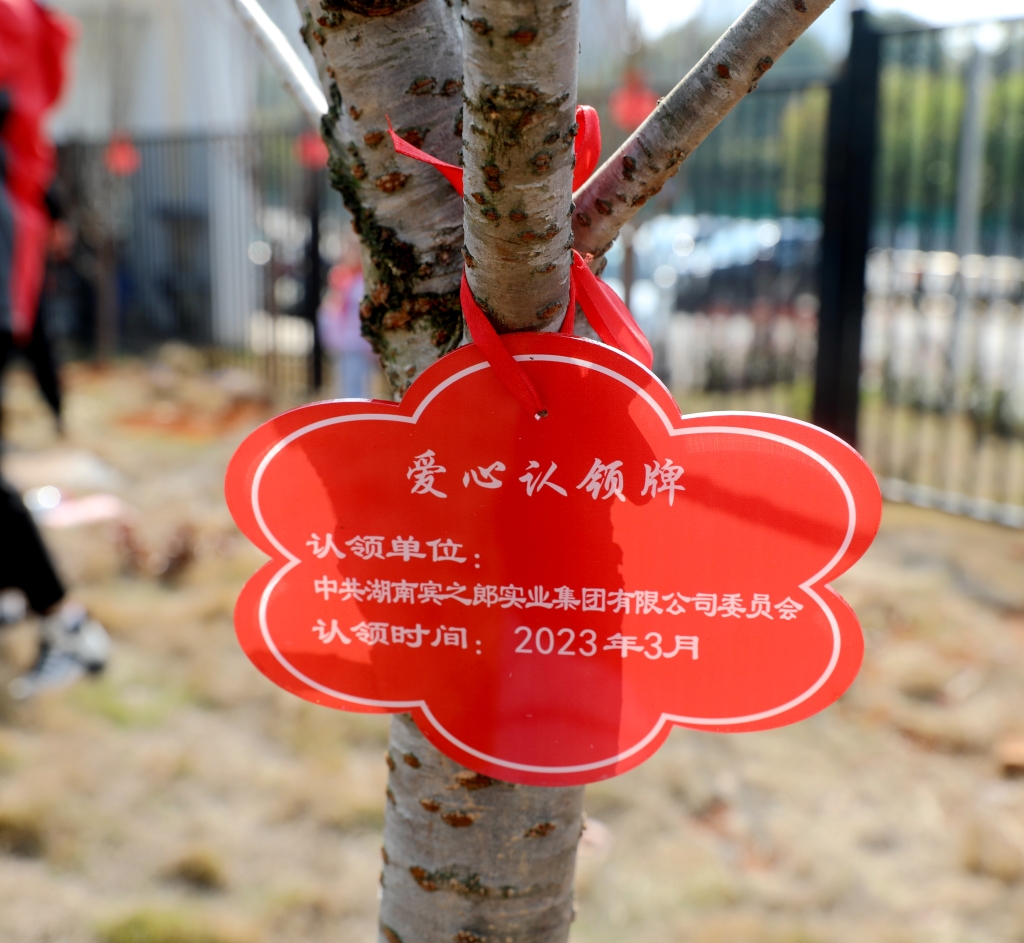 完成種植后,大家為樹苗系上獨屬賓之郎黨委的愛心認領牌,并與小樹合影留念。