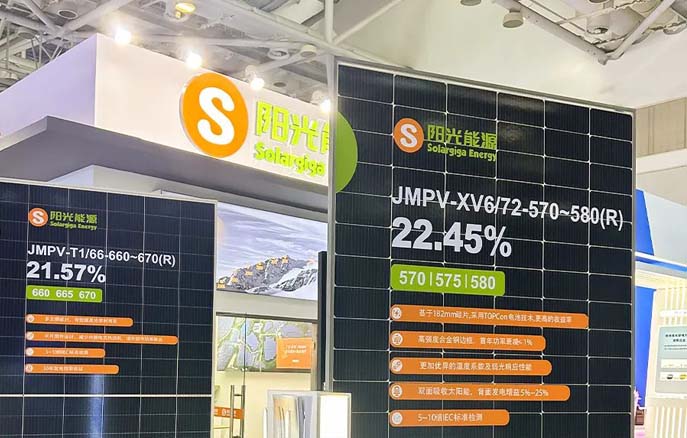 本屆展會,陽光能源重點展示了Giga-N系列兩款高效產(chǎn)品,分別是182 72版型雙玻和182 54版型單玻全黑組件,采用前沿的N型TOPCon技術(shù),具備高效率、高發(fā)電量、高品質(zhì)等多重優(yōu)勢,能夠為客戶帶來更高的價值。其中,182 54版型單玻全黑組件是陽光能源面向全球分布式市場打造的高端產(chǎn)品之一,外觀精美,量產(chǎn)效率可達21.76%,被廣泛應(yīng)用于建筑屋頂?shù)葢?yīng)用場景。