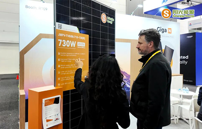 另一款明星產(chǎn)品——Giga-N 系列瓷白組件,憑借其 730W 的高功率和 23.5% 的轉(zhuǎn)換效率,體現(xiàn)了陽(yáng)光能源在光伏技術(shù)研發(fā)方面的扎實(shí)積累,獲得了現(xiàn)場(chǎng)觀眾的廣泛關(guān)注;其 18BB 多主柵設(shè)計(jì)有效降低了內(nèi)部損耗,結(jié)合 -0.280%/℃ 的優(yōu)異溫度系數(shù)與強(qiáng)大的抗 PID 性能,確保了在高溫等嚴(yán)苛環(huán)境下的發(fā)電穩(wěn)定性和長(zhǎng)期可靠性,為關(guān)注發(fā)電效益的用戶提供了一個(gè)高性能的選擇方案。