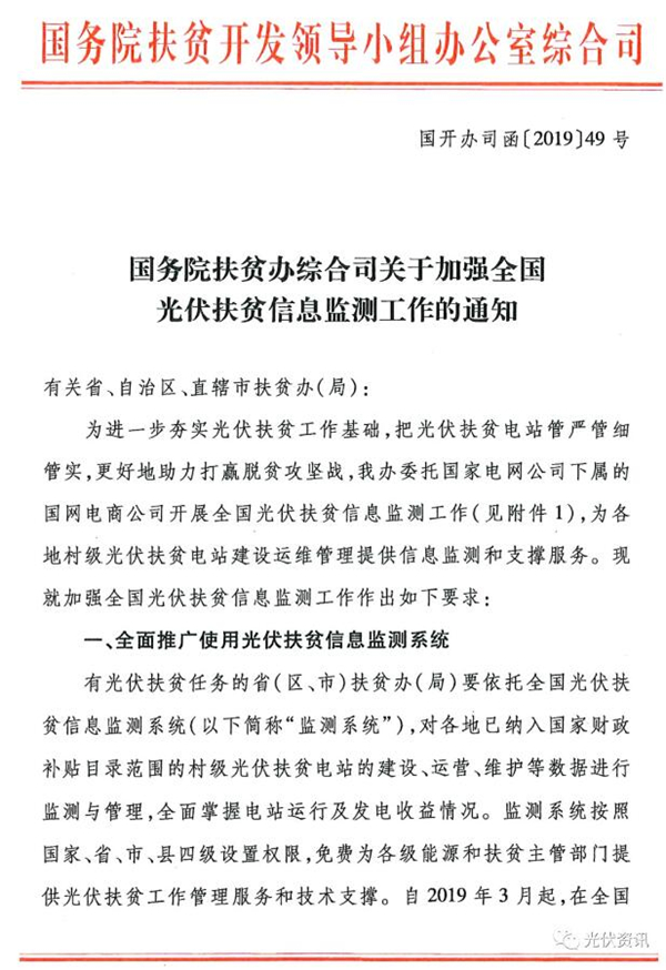 日前,國務(wù)院扶貧辦綜合司關(guān)于加強(qiáng)全國光伏扶貧信息監(jiān)測工作的通知,原文如下: