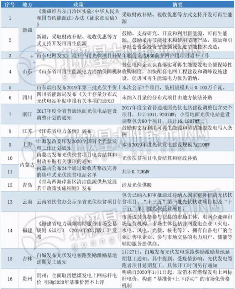 整個(gè)1月共計(jì)14個(gè)省份出臺(tái)了18項(xiàng)光伏相關(guān)政策,如新疆、山東、四川、江蘇、上海、內(nèi)蒙古、青島、雲(yún)南、福建、吉林、貴州、河北。