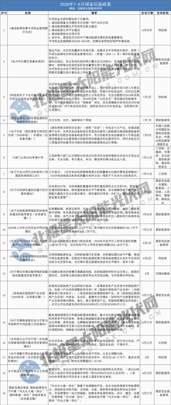 國(guó)家層面,7、8月份共發(fā)佈19項(xiàng)光伏政策,涉及可再生能源電價(jià)補(bǔ)貼、光伏競(jìng)/平價(jià)政策、電力市場(chǎng)交易、BIPV、風(fēng)光儲(chǔ)一體化專案等多個(gè)方面。